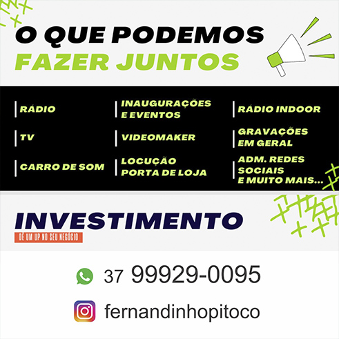 Você Está Aqui Home  > PUBLICIDADE DIGITAL >  Fernandinho Pitoco - Radialista - Carro de Som com melhor preço - Apresentador para eventos - Inaugurações e Eventos - Videomaker - Gravações personalizadas em Geral - Rádio Indoor - Locução porta de Loja com equipamento profissional - Publicidade em carro volante - Divinópolis-MG.